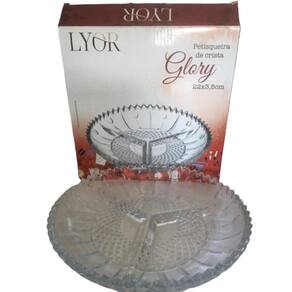 Petisqueira Cristal Transparente Redonda com três divisória. Ideal para colocar seus petiscos prediletos e saborear com um vinho, uma cerveja, suco ou refrigerante. Ficará linda na sua mesa para decorar seus encontros, festas e Happy Hour. Tamanho: 22cm de diâmetro X 3,5cm Altura Cor: Transparente Material: Cristal Lapidado Marca: Lyor Pode ser lavado com esponja e sabão neutro.