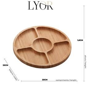 Petisqueira de Bambu com 5 Divisórias Round 25cm x 25cm x 1,6cm - Lyor:----TENHA EM SUA CASA TODO CHARME E ELEGÂNCIA DA LYOR. ESSE ITEM DEIXARÁ A SUA CASA MUITO MAIS ELEGANTE PARA RECEBER SEUS CONVIDADOS. ----Forno: NÃO/ Fogão: NÃO/ Lava louça: NÃO/ Micro-Ondas: NÃO ----- Cuidados Limpeza e Manutenção: LAVAR COM DETERGENTE NEUTRO, ESPONJA MACIA E SECAR IMEDIATAMENTE. NÃO LAVAR EM MÁQUINAS, NÃO UTILIZAR PRODUTOS QUÍMICO. ----Matéria Prima: BAMBU NA