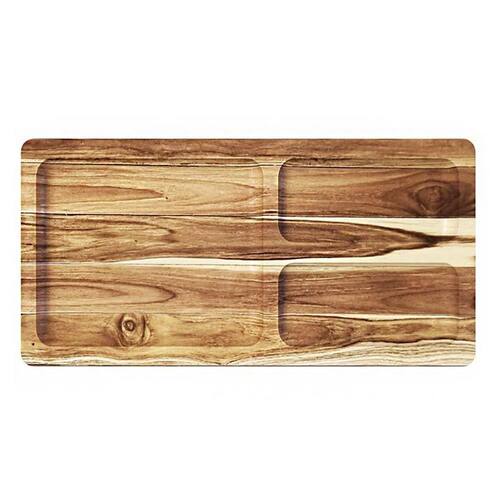 - Material: Madeira Teca nobre e resistente - Compartimentos: 3 espaços para separar os alimentos - Uso: Ideal para petiscos, entradas, aperitivos, queijos, frios, molhos etc. - Design: Sofisticado, funcional e sem alças - fácil de guardar e combinar com a mesa