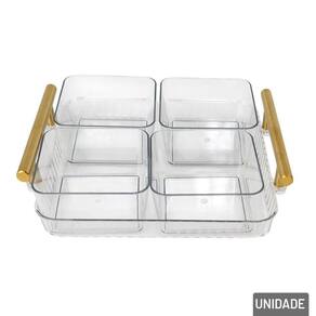 Petisqueira Plástica 21x20cm 4 Divisórias c Transforme seus momentos de confraternização com mais estilo e funcionalidade usando a Petisqueira Plástica. Ideal para servir petiscos, doces, frutas, aperitivos e snacks de forma prática e charmosa, ela é a escolha perfeita para compor a mesa em festas, reuniões familiares ou encontros entre amigos.\nCom design retangular moderno, essa petisqueira conta com 4 divisórias bem distribuídas, que permitem separar os alimentos com higiene e organização, além de uma alça central dourada que adiciona um toque de sofisticação e facilita o transporte com segurança e elegância.\nMedidas: Base 21,5x20x5,5cm, Potes 10,8,5x5cm.\nEspecificações:\nMarca : KIT GIRL\nTipo de material : Plástico\nCores ou Estampa : Transparente\nDimensões do Produto : 5,5 X 21 X 20 CM\nDimensões da Embalagem : 25 X 21 X 6 CM\nPeso Bruto (Gramas) : 0.503