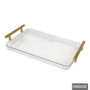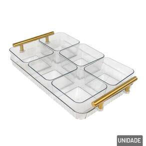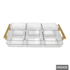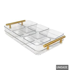 Petisqueira Plástica 31x20cm 6 Divisórias c Transforme seus momentos de confraternização com mais estilo e funcionalidade usando a Petisqueira Plástica. Ideal para servir petiscos, doces, frutas, aperitivos e snacks de forma prática e charmosa, ela é a escolha perfeita para compor a mesa em festas, reuniões familiares ou encontros entre amigos.\nCom design retangular moderno, essa petisqueira conta com 6 divisórias bem distribuídas, que permitem separar os alimentos com higiene e organização, além de uma alça central dourada que adiciona um toque de sofisticação e facilita o transporte com segurança e elegância.\nMedidas: Base 31x20x5,5, Potes 10x8,5x5cm.\nEspecificações:\nMarca : KIT GIRL\nTipo de material : Plástico\nCores ou Estampa : Transparente\nDimensões do Produto : 5,5 X 31 X 20 CM\nDimensões da Embalagem : 35 X 21 X 6 CM\nPeso Bruto (Gramas) : 0.687