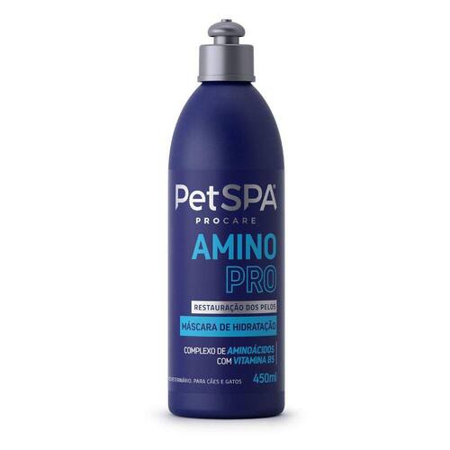 Máscara de hidratação AMINO PRO é um produto para todos os tipos de pelo, ideal para tratamento de pelos danificados. Sua fórmula composta por aminoácidos promove reparação e fortalecimento dos pelos desde a primeira aplicação. Seus ativos agem no fechamento de cuti´culas auxiliando na hidratac¸a~o dos fios, facilitando a penteabilidade e reduzindo o tempo de secagem em ate´ 50%.Água Deionizada, Álcool Cetoestearílico, Álcool Cetílico, Cloreto de Behentrimônio, Glicerina, Cloreto de Cetil Trimetil Amônio, Condicionante, Álcool Cetoestearílico Etoxilado, Silicones, Emolientes, Aminoácidos, Antioxidante, EDTA Dissódico, Conservantes, Fragrância, Ácido Lático.Aplicar a Máscara PetSPA Amino Pro no pelo do animal já molhado. Massagear do comprimento para as pontas de 3 a 5 minutos para melhor desempenho. Enxaguar até sair totalmente o produto. Repetir a operação, se necessário. Para melhores resultados, utilizar o shampoo PetSPA Amino Pro. Marca: PetSPA