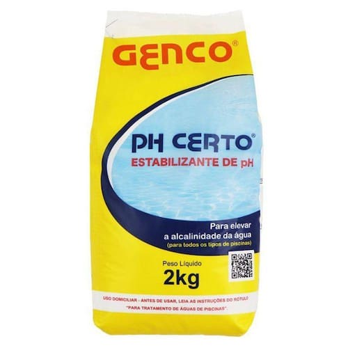 Produto em grânulos para repor a alcalinidade total da água e assim estabilizar o ph. Indicado para todo tipo de piscinas especialmente as que utilizam o genclor cloro estabilizado genco, pois este produto consome a alcalinidade da água produzindo abaixamento do ph.Validade: 3 anosdisponível nas embalagens: 2 kg e 40 kgdosagem recomendada: 17 g /m3 para aumentar a alcalinidade total em 10 ppm1 a dosagem de 17 g/m3 gramas por 1000 litros de água de ph certo genco aumenta a alcalinidade em 10 ppm. A dosagem correta de ph certo genco a ser utilizada deve ser determinada com o estojo de análises genco 3 em 1-ot. Caso a faixa esteja inferior à recomendada, adicione o ph certo genco até atingir a faixa ideal de 80 a 120 ppm.2 adicionar a quantidade recomendada de ph certo genco diretamente à água da piscina ou dissolvê-la previamente num balde e distribuir essa solução uniformemente sobre a superfície da água. Manter a filtração ou recirculação da água em funcionamento por 30 a 60 minutos para homogeneizar a solução.3 no dia seguinte ao da adição do ph certo genco , analise o ph com o estojo de análises genco 3 em 1-ot E corrija-o com ph+ mais barrilha genco se estiver abaixo de 7,2 ou com ph- menos genco se estiver acima de 7,8 .4 analise a alcalinidade semanalmente e recomplete-a com ph certo genco sempre que necessário.