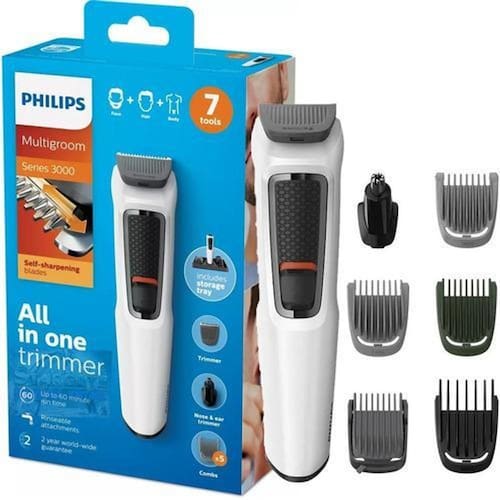 Philips máquina barbear elétrica kit completo 7 peças bivolt inovação e qualidade são os valores mais altos que representam a philips. Desde seus começos, esta marca de origem holandesa se propôs a ser uma referência mundial no mercado de tecnologias. Sua linha estética de corte se destaca por sua funcionalidade, e deixará a superfície da sua pele reluzente e uniforme. Inovação e tecnologia esqueça de limpar sua máquina em seco: ao ser lavável, você poderá molhar e enxaguar quantas vezes precisar. O aparador multifuncional, 7 em 1, para barba e cabelo. Apare os pelos acima do pescoço e cabelo de forma eficiente e rápida este modelo foi projetado para ser potente sem comprometer o conforto da pele. Seguro e confiável, apara contornos de barba, bigode, pelos faciais, do nariz e também o cabelo. Caracteríticas: marca philips modelo serie 3000 biv mg3721/77 cor branco bivolt lâminas autoafiadoras aparador de pelos do nariz e orelhas pente para cabelos 9mm pente para corpo 3mm pente ajustável para barba de 3mm a 7mm 2 pentes para barba curta em 1mm e 2mm totalmente lavável 60 min. De uso / 16h de carga
