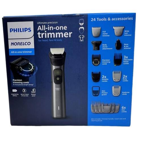 O Philips Norelco Multigroomer é um aparador multifuncional que proporciona a máxima precisão para um cuidado superior do cabelo, rosto e corpo. Desfrute do melhor estilo da categoria com tecnologia BeardAdapt para aumentar a potência exatamente quando você precisa para lidar com barbas densas, espessas ou mais longas. Existem 24 ferramentas e acessórios incluídos para criar uma aparência personalizada. Nosso NOVO pente aparador de precisão oferece 5x mais configurações de comprimento em comparação com nosso antecessor, permitindo mais personalização do que nunca com configurações de comprimento em etapas de 0,2 mm. Também está incluído nosso NOVO protetor Skin Protect, projetado para proporcionar uma aparência limpa e, ao mesmo tempo, proteção extra para a pele. Há também um acessório de barbear corporal para uma limpeza segura e suave. A bateria de íon de lítio rende 2 horas de autonomia, além de um recurso de carga rápida para poder obter um acabamento completo com apenas 5 minutos de carregamento. Este kit tem tudo que você precisa para cuidar de toda a cabeça, rosto e corpo Pente aparador ajustável com configurações de comprimento em etapas de 0,2 mm de 1 a 3 mm A tecnologia BeardAdapt verifica a densidade da barba 125x por segundo Cabo de carregamento USB-A incluído adaptador de energia de parede não incluído 100% à prova de banho Modelo: MG9525/40 dos EUA Marca: Não Informado
