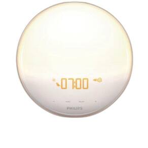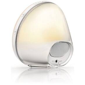 Relaxe e adormeça com o pôr-do-sol e sons ofuscantes. O despertador de simulação colorido do amanhecer o desperta gradualmente com uma lâmpada de luz natural e um alto-falante que reproduz uma escolha de 5 sons de despertar calmantes