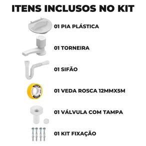 Pia Lavatório Banheiro Plástico 4,0L Branca A pia plástica para banheiro da marca Astra é uma opção prática e funcional para instalação em ambientes com espaços reduzidos. Com dimensões compactas e design simples, é fabricada em polipropileno de alta qualidade, o que garante sua resistência e durabilidade. ESPECIFICAÇÕES TÉCNICAS Material: Polipropileno Dimensões: 35,5 x 28 x 15,8cm Possui Porta Sabonete: Sim Possui Furo Para Torneira: Não Capacidade: 4,0L Locais Sugeridos: Banheiros e Lavabos Acabamento: Brilhante Cor: Branca Formato: Oval do Fabricante: 90 dias Torneira Para Lavatório Plástica Branca A torneira para lavatório possui o volante anatômico, que facilita a abertura e o fechamento, o plástico ABS com proteção UV, e a durabilidade e a qualidade sempre presente nos produtos. ESPECIFICAÇÕES TÉCNICAS Composição: Plástico de engenharia ABS , Polipropileno PP e elastômeros Utilização: Água fria Fabricação: Nacional Sifão Sanfonado Universal 73cm Branco O sifão sanfonado universal é um acessório essencial de encanamento, projetado para se adaptar a qualquer saída de válvula de pia e a qualquer tubulação de esgoto, independentemente de seu tamanho ou tipo. Além disso, o sifão sanfonado corrige possíveis desalinhamentos entre a cuba e a tubulação de despejo, evitando assim a formação de bloqueios e obstruções que possam causar vazamentos ou refluxo de água suja. Esse acessório é ideal para tanques, pias e cubas em banheiros, cozinhas e lavanderias. ESPECIFICAÇÕES TÉCNICAS Material: Polipropileno Entrada Para Válvula Polegada : 7/8 Saída Para Tubos e Conexões: 38, 40, 48 e 50mm Modelo: Para pias, cubas, tanques, lavatórios e válvula americana Suporta temperatura até: 90 graus Cor: Branco Acabamento: Brilhante Manual de Instalação: Sim ITENS INCLUSOS 01 Pia Plástica 01 Válvula Com tampa 04 Buchas S6 04 Parafusos 3,5 x 30mm 01 Rolo de Fita Veda Rosca 12mm x 5m 01 Torneira Plástica 01 Sifão Marca: Não Informado