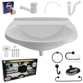 Pia lavatorio banheiro plástico 8l branca astra A pia plástica para banheiro da marca astra é uma opção prática e funcional para instalação em ambientes com espaços reduzidos. Com dimensões compactas e design simples, é fabricada em polipropileno de alta qualidade, o que garante sua resistência e durabilidade. Com capacidade de armazenamento de 8 litros, essa pia é indicada para uso em banheiros e lavabos, sendo uma solução ideal para quem busca uma alternativa econômica e de fácil instalação. Além disso, sua superfície lisa facilita a limpeza e manutenção, permitindo que ela se mantenha higiênica e livre de germes e bactérias. Especificações técnicas Material: polipropileno Dimensões: 35,5 x 28 x 15,8cm Possui porta sabonete: sim Possui furo para torneira: não Capacidade: 8,0l Locais sugeridos: banheiros e lavabos Acabamento: brilhante Marca: astra Cor: preto Formato: oval do fornecedor: 90 dias Kit para banheiro redondo 5 peças preto japi Os acessórios para banheiro são itens essenciais para manter o ambiente organizado, prático e funcional. A papeleira é um suporte para papel higiênico que geralmente é instalado na parede, próximo ao vaso sanitário. O porta toalha argola é um item importante para manter as toalhas sempre à mão e secas. Ele pode ser instalado na parede ou na porta do armário, por exemplo. O porta toalha possui a mesma funcionalidade, e geralmente é fixado na parede, próximo ao chuveiro ou banheira. O cabide simples é um item que serve para pendurar roupas, toalhas e acessórios. Ele pode ser instalado na parede ou na porta do armário, por exemplo. A saboneteira é um item que serve para apoiar o sabonete, mantendo-o seco e evitando que escorregue. Dessa forma, é possível garantir um banheiro organizado e bem equipado, que atenda às necessidades dos usuários. Especificações técnicas Material: poliestireno e alumínio Locais sugeridos: banheiros e lavabos Cor: branco Acabamento: brilhante do fabricante: 5 anos Torneira para lavatório plástica branca japi A torneira para lavatório possui o volante anatômico, que facilita a abertura e o fechamento, o plástico abs com proteção uv, e a durabilidade e a qualidade sempre presente nos produtos da japi. Especificações técnicas Composição: plástico de engenharia abs , polipropileno pp e elastômeros Utilização: água fria Fabricação: nacional Sifão sanfonado universal 61cm branco astra O sifão sanfonado universal astra é um acessório essencial de encanamento, projetado para se adaptar a qualquer saída de válvula de pia e a qualquer tubulação de esgoto, independentemente de seu tamanho ou tipo. Além disso, o sifão sanfonado universal astra corrige possíveis desalinhamentos entre a cuba e a tubulação de despejo, evitando assim a formação de bloqueios e obstruções que possam causar vazamentos ou refluxo de água suja. Esse acessório é ideal para tanques, pias e cubas em banheiros, cozinhas e lavanderias. Especificações técnicas Material: polipropileno Entrada para válvula polegada : 7/8 Saída para tubos e conexões: 38, 40, 48 e 50mm Modelo: para pias, cubas, tanques, lavatórios e válvula americana Suporta temperatura até: 90 graus Cor: branco Acabamento: brilhante do fabricante: 90 dias O kit segue com todos os itens para montagem e pronto para uso após a instalação A se aplica a todo e qualquer vício ou defeito aparente ou que não estejam em conformidade com o produto. - 90 dias para a pia plástica - 90 dias para o sifão - 30 dias para a torneira - 5 anos para o kit de banheiro redondo Itens inclusos 01 pia plástica 01 torneira 01 sifão 01 engates 01 rolo de fita veda rosca 12mm x 5m 01 suporte 01 válvula com tampa 04 buchas s6 04 parafusos 3,5 x 30mm 01 cabide simples 01 saboneteira 01 papeleira 01 porta toalha argola 01 porta toalha 06 buchas s6 06 parafusos 3 x 37mm