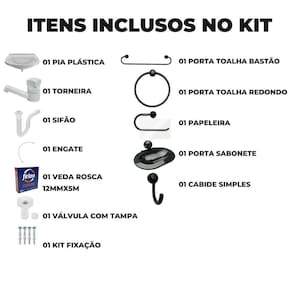 Pia lavatorio banheiro plástico 8l branca astra A pia plástica para banheiro da marca astra é uma opção prática e funcional para instalação em ambientes com espaços reduzidos. Com dimensões compactas e design simples, é fabricada em polipropileno de alta qualidade, o que garante sua resistência e durabilidade. Com capacidade de armazenamento de 8 litros, essa pia é indicada para uso em banheiros e lavabos, sendo uma solução ideal para quem busca uma alternativa econômica e de fácil instalação. Além disso, sua superfície lisa facilita a limpeza e manutenção, permitindo que ela se mantenha higiênica e livre de germes e bactérias. Especificações técnicas Material: polipropileno Dimensões: 35,5 x 28 x 15,8cm Possui porta sabonete: sim Possui furo para torneira: não Capacidade: 8,0l Locais sugeridos: banheiros e lavabos Acabamento: brilhante Marca: astra Cor: preto Formato: oval do fornecedor: 90 dias Kit para banheiro redondo 5 peças preto japi Os acessórios para banheiro são itens essenciais para manter o ambiente organizado, prático e funcional. A papeleira é um suporte para papel higiênico que geralmente é instalado na parede, próximo ao vaso sanitário. O porta toalha argola é um item importante para manter as toalhas sempre à mão e secas. Ele pode ser instalado na parede ou na porta do armário, por exemplo. O porta toalha possui a mesma funcionalidade, e geralmente é fixado na parede, próximo ao chuveiro ou banheira. O cabide simples é um item que serve para pendurar roupas, toalhas e acessórios. Ele pode ser instalado na parede ou na porta do armário, por exemplo. A saboneteira é um item que serve para apoiar o sabonete, mantendo-o seco e evitando que escorregue. Dessa forma, é possível garantir um banheiro organizado e bem equipado, que atenda às necessidades dos usuários. Especificações técnicas Material: poliestireno e alumínio Locais sugeridos: banheiros e lavabos Cor: branco Acabamento: brilhante do fabricante: 5 anos Torneira para lavatório plástica branca japi A torneira para lavatório possui o volante anatômico, que facilita a abertura e o fechamento, o plástico abs com proteção uv, e a durabilidade e a qualidade sempre presente nos produtos da japi. Especificações técnicas Composição: plástico de engenharia abs , polipropileno pp e elastômeros Utilização: água fria Fabricação: nacional Sifão sanfonado universal 61cm branco astra O sifão sanfonado universal astra é um acessório essencial de encanamento, projetado para se adaptar a qualquer saída de válvula de pia e a qualquer tubulação de esgoto, independentemente de seu tamanho ou tipo. Além disso, o sifão sanfonado universal astra corrige possíveis desalinhamentos entre a cuba e a tubulação de despejo, evitando assim a formação de bloqueios e obstruções que possam causar vazamentos ou refluxo de água suja. Esse acessório é ideal para tanques, pias e cubas em banheiros, cozinhas e lavanderias. Especificações técnicas Material: polipropileno Entrada para válvula polegada : 7/8 Saída para tubos e conexões: 38, 40, 48 e 50mm Modelo: para pias, cubas, tanques, lavatórios e válvula americana Suporta temperatura até: 90 graus Cor: branco Acabamento: brilhante do fabricante: 90 dias O kit segue com todos os itens para montagem e pronto para uso após a instalação A se aplica a todo e qualquer vício ou defeito aparente ou que não estejam em conformidade com o produto. - 90 dias para a pia plástica - 90 dias para o sifão - 30 dias para a torneira - 5 anos para o kit de banheiro redondo Itens inclusos 01 pia plástica 01 torneira 01 sifão 01 engates 01 rolo de fita veda rosca 12mm x 5m 01 suporte 01 válvula com tampa 04 buchas s6 04 parafusos 3,5 x 30mm 01 cabide simples 01 saboneteira 01 papeleira 01 porta toalha argola 01 porta toalha 06 buchas s6 06 parafusos 3 x 37mm