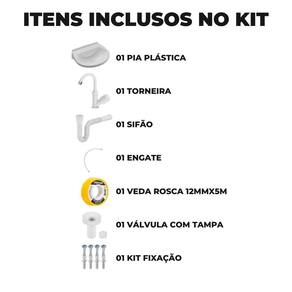 Pia Lavatório Banheiro Plástico 8L Branca A pia plástica para banheiro da marca Astra é uma opção prática e funcional para instalação em ambientes com espaços reduzidos. Com dimensões compactas e design simples, é fabricada em polipropileno de alta qualidade, o que garante sua resistência e durabilidade. ESPECIFICAÇÕES TÉCNICAS Material: Polipropileno Dimensões: 50 x 18,3 x 40cm Possui Porta Sabonete: Sim Possui Furo Para Torneira: Não Capacidade: 8L Locais Sugeridos: Banheiros e Lavabos Acabamento: Brilhante Cor: Branca Formato: Oval do Fabricante: 90 dias Torneira Para Lavatório Bica Móvel Branca A torneira para lavatório bica móvel possui o volante anatômico, que facilita a abertura e o fechamento, o arejador, que reduz em até 50% o consumo de água e proporciona um jato suave e sem respingos, a bica móvel, que entrega praticidade no uso diário, o plástico ABS com proteção UV, e a durabilidade e a qualidade sempre presente nos produtos. ESPECIFICAÇÕES TÉCNICAS Composição: Plástico de engenharia ABS , Polipropileno PP e elastômeros Utilização: Água fria Fabricação: Nacional Sifão Sanfonado Universal 73cm Branco O sifão sanfonado universal é um acessório essencial de encanamento, projetado para se adaptar a qualquer saída de válvula de pia e a qualquer tubulação de esgoto, independentemente de seu tamanho ou tipo. Além disso, o sifão sanfonado corrige possíveis desalinhamentos entre a cuba e a tubulação de despejo, evitando assim a formação de bloqueios e obstruções que possam causar vazamentos ou refluxo de água suja. Esse acessório é ideal para tanques, pias e cubas em banheiros, cozinhas e lavanderias. ESPECIFICAÇÕES TÉCNICAS Material: Polipropileno Entrada Para Válvula Polegada : 7/8 Saída Para Tubos e Conexões: 38, 40, 48 e 50mm Modelo: Para pias, cubas, tanques, lavatórios e válvula americana Suporta temperatura até: 90 graus Cor: Branco Acabamento: Brilhante Manual de Instalação: Sim ITENS INCLUSOS 01 Pia Plástica 01 Suporte 01 Válvula Com tampa 03 Buchas S10 02 Buchas S6 03 Parafusos 3,5 x 55mm 02 Parafusos 3,5 x 30mm 05 Arruelas 01 Torneira Plástica 01 Sifão 01 Rolo de Fita Veda Rosca 12mm x 5m 01 Engate Flexível 40cm x 1/2