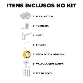 Pia Lavatório Banheiro Plástico 8L Branca A pia plástica para banheiro da marca Astra é uma opção prática e funcional para instalação em ambientes com espaços reduzidos. Com dimensões compactas e design simples, é fabricada em polipropileno de alta qualidade, o que garante sua resistência e durabilidade. ESPECIFICAÇÕES TÉCNICAS Material: Polipropileno Dimensões: 50 x 18,3 x 40cm Possui Porta Sabonete: Sim Possui Furo Para Torneira: Não Capacidade: 8L Locais Sugeridos: Banheiros e Lavabos Acabamento: Brilhante Cor: Branca Formato: Oval do Fabricante: 90 dias Torneira Para Lavatório Plástica Branca A torneira para lavatório possui o volante anatômico, que facilita a abertura e o fechamento, o plástico ABS com proteção UV, e a durabilidade e a qualidade sempre presente nos produtos. ESPECIFICAÇÕES TÉCNICAS Composição: Plástico de engenharia ABS , Polipropileno PP e elastômeros Utilização: Água fria Fabricação: Nacional Sifão Sanfonado Universal 73cm Branco O sifão sanfonado universal é um acessório essencial de encanamento, projetado para se adaptar a qualquer saída de válvula de pia e a qualquer tubulação de esgoto, independentemente de seu tamanho ou tipo. Além disso, o sifão sanfonado corrige possíveis desalinhamentos entre a cuba e a tubulação de despejo, evitando assim a formação de bloqueios e obstruções que possam causar vazamentos ou refluxo de água suja. Esse acessório é ideal para tanques, pias e cubas em banheiros, cozinhas e lavanderias. ESPECIFICAÇÕES TÉCNICAS Material: Polipropileno Entrada Para Válvula Polegada : 7/8 Saída Para Tubos e Conexões: 38, 40, 48 e 50mm Modelo: Para pias, cubas, tanques, lavatórios e válvula americana Suporta temperatura até: 90 graus Cor: Branco Acabamento: Brilhante Manual de Instalação: Sim ITENS INCLUSOS 01 Pia Plástica 01 Suporte 01 Válvula Com tampa 03 Buchas S10 02 Buchas S6 03 Parafusos 3,5 x 55mm 02 Parafusos 3,5 x 30mm 05 Arruelas 01 Torneira Plástica 01 Sifão 01 Rolo de Fita Veda Rosca 12mm x 5m 01 Engate Flexível 40cm x 1/2 Marca: Não Informado