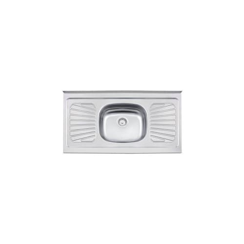 Pia com 1 central cuba + escorredor. Aço Inox AISI 430. 0,6 mm de espessura. Acabamento pré-polido. Acompanha válvula de 3 1/2.
