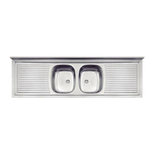 Pia com 2 cubas centrais escorredor. Aço Inox AISI 304. 0,7 mm de espessura. Capacidade: 15,5 15,5 L Acabamento pré-polido. Acompanha válvula de 4 1/2 . Ean: 7894693749635