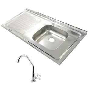 Pia de cozinha de aço inox, para gabinete, medindo 100x52Cm, com cuba simples à direita com furo e torneira TIPO DE AÇO: AISI430 (FERRÍTICO) PREENCHIMENTO: CONCRETADO INSTALAÇÃO: SOPREPOR GABINETE / MÃO-FRANCESA / MURETAS DE ALVENARIA MEDIDAS: 100x52Cm CUBA: SIMPLES 36x34x11Cm ACABAMENTO: TAMPO BRILHANTE / CUBA FOSCA VALVULA: 3 ½ NÃO INCLUSA ANTI-RUÍDO: NÃO INCLUSO GARANTIA: 1 ANO