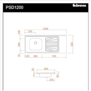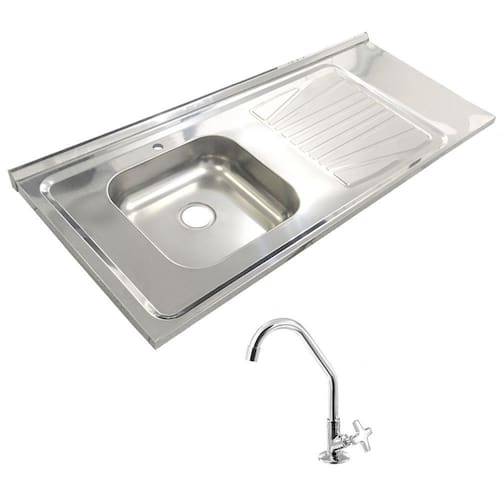 Pia de cozinha de aço inox, para gabinete, medindo 120x52Cm, cuba esquerda com furo e torneira TIPO DE AÇO: AISI430 (FERRÍTICO) PREENCHIMENTO: CONCRETADO INSTALAÇÃO: SOPREPOR GABINETE / MÃO-FRANCESA / MURETAS DE ALVENARIA MEDIDAS: 120x52Cm CUBA: SIMPLES 36x34x11Cm ACABAMENTO: TAMPO BRILHANTE / CUBA FOSCA VALVULA: 3 ½ NÃO INCLUSA ANTI-RUÍDO: NÃO INCLUSO GARANTIA: 1 ANO