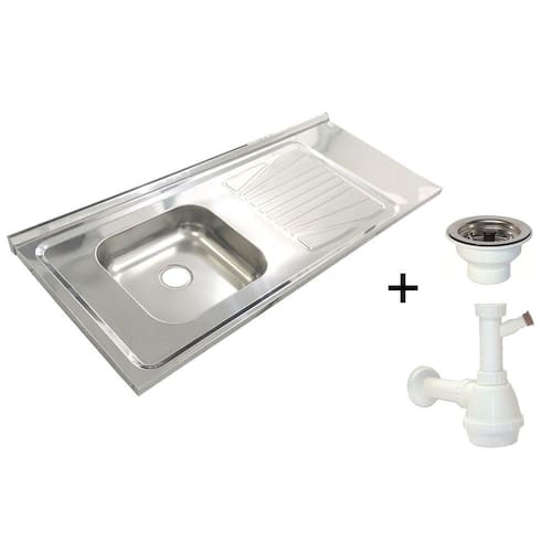 Pia de cozinha de aço inox, para gabinete, medindo 120x52Cm, cuba esquerda com válvula e sifão TIPO DE AÇO: AISI430 (FERRÍTICO) PREENCHIMENTO: CONCRETADO INSTALAÇÃO: SOPREPOR GABINETE / MÃO-FRANCESA / MURETAS DE ALVENARIA MEDIDAS: 120x52Cm CUBA: SIMPLES 36x34x11Cm ACABAMENTO: TAMPO BRILHANTE / CUBA FOSCA VALVULA: 3 ½ INCLUSA ANTI-RUÍDO: NÃO INCLUSO GARANTIA: 1 ANO