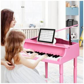 A certificação ASTM garante segurança: Delicadamente feito de ABS de alta qualidade e pernas de madeira maciça de bétula, este piano infantil apresenta desempenho perfeito em durabilidade duradoura e grande robustez. Além disso, o acabamento pintado não prejudica a pele das crianças durante o uso e os cantos arredondados trazem uma sensação total de segurança. Piano de 30 teclas com tamanho apropriado: Vindo com 30 teclas pretas e brancas, este lindo piano oferece muita diversão musical e som preciso para seus filhos. Além disso, o tamanho das teclas é menor do que o tamanho padrão de um piano real, o que pode caber perfeitamente nos dedos das crianças e fazer a transição para um piano maior à medida que crescem. Ótimo instrumento musical educacional: O artesanato requintado confere a aparência clássica e o som agradável deste piano, que atrairá a atração das crianças à primeira vista. Graças à estante de partitura e ao banco confortável, as crianças podem desfrutar de uma experiência musical envolvente e brincar com este instrumento de teclado com facilidade. Uma grande surpresa para seus filhos Este adorável piano de madeira de 30 teclas é um presente especial de aniversário ou de Natal para crianças com mais de 2 anos. Além de proporcionar o máximo de diversão em família, o piano de cauda contribui para o desenvolvimento da inteligência das crianças, melhora a coordenação motora e inspira a iluminação musical. Fácil de montar e limpar: Todas as peças e ferragens necessárias estão bem embrulhadas. Sob a orientação das instruções, o baby grand de 30 teclas é fácil de montar sem esforço. Além disso, a superfície lisa só precisa ser limpa levemente com pano úmido, economizando muito esforço e tempo na manutenção diária.