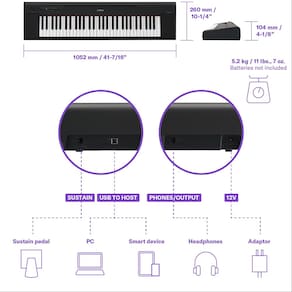 O teclado de 61 teclas (um piano convencional tem 88 teclas) é perfeito para tocar músicas pop ou peças clássicas simples. Embora as teclas tenham o mesmo formato que as de um piano real, o teclado tem uma sensação mais leve que facilita o começo para pianistas iniciantes, em vez da sensação mais pesada das teclas de piano acústico. Você também pode usar fones de ouvido com o NP-15 para estudar a noite ou em lugares que precisam de silêncio.Especificações- Marca: Yamaha- Modelo: NP15B- Origem: China- Cor: Preto- Quantidade de Teclas: 61- Quantidade de oitavas: 5- Painel: Inglês- Polifonia: 64- Número sons: 15- Músicas integradas: 25- Efeitos: Reverberação (6 tipos), Sound Boost, Dual- Músicas pré-definidas: 15 músicas de demonstração de voz + 10 músicas de piano - Amplificadores: 2.5W + 2.5W- Alto-falantes: (12 cm x 8 cm) x 2- Consumo de energia: 3,5 w- Desligamento automático - Dimensões (LxAxP): 105,2 x 10,4 x 26 cm- Peso: 5,2 kgConteúdo da Embalagem- 01 Piano Digital Yamaha NP-15B Piaggero Preto- 01 Porta Partitura- 01 Fonte de Alimentação PA-130B- Manual do Proprietário- Dimensões da Embalagem (AxLxP): 20 x 36 x 120 cm*imagens meramente ilustrativas