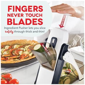 MAIS Projetado para manter as mãos e os dedos longe das lâminas, para uma maneira mais fácil e segura de fatiar. A alça com mola se abre, então basta empurrar para baixo para fatiar em segundos tão fácil que até seus filhos podem usá la