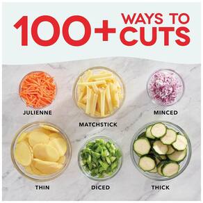 VERSÁTIL Fatia, juliana, palito de fósforo, dados e muito mais para uma preparação fácil da refeição, com 30 cortes predefinidos diferentes para espessuras variadas 1 . salgadinhos