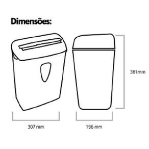 Especificações: Voltagem: 220v Até 10 folhas A4 (75g/m²) ou 1 cartão de crédito; Corta em em tiras de 6mm; Nível de segurança P-2 (Norma DIN 66399); Design Ergonômico com alça para facilitar a limpeza do cesto; Com cesto de 13,2 litros; Botão com 3 posições Auto / Off / Rev; Proteção contra superaquecimento do motor; Baixo nível de ruído (70db); Tempo de fragmentação contínua: uso 2 min / descanso 30 minutos Velocidade de fragmentação: 3,0 m/minuto; Picota 202 folhas por ciclo Abertura da fenda: 220mm; Sensor automático de presença de papel; Assistência técnica em todo o território nacional.