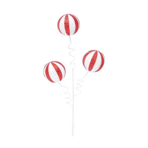 Galho 3 bolas listras vermelhas e brancas - Embalagem de Venda: 1 UN - Cor Predominante: VERMELHO / BRANCO - Instruções de Limpeza: Limpar somente com pano macio levemente umedecido com água. - Composição: Plástico, Poliéster, Metal, Isopor e Papel.