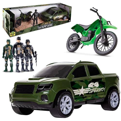 Carro pick-up roda livre force warfare com boneco + moto na caixaCódigo1228306Informações adicionais:Produto certificado: ce- bri/brics 00275-16Ean: 7898631556002Validade: indeterminadaIndicação: maiores de 3 anosTamanho aproximado da caixa: a:11,5xl:45xp:11cmPeso aproximado: 280gTipo de produto: carro pick-up roda livre force warfare com boneco + moto na caixaCor: coloridoComposição: plastico Marca: Diverpast