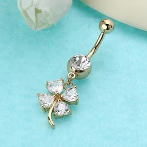 Piercing de umbigo em aço cirúrgico banhado a ouro.Pedras de zircônia em formato de trevoSimplesmente LINDOUma linda peça para ser usada no dia a dia e em qualquer ocasião.Os Piercings são peças em Aço e seus Pingentes em liga de zinco banhada com outro metal, neste caso as peças recebem um banho de Ouro peças douradas . Porém como qualquer peça banhada este banho pode sofrer desgaste independente de sua qualidade. Existem fatores que aceleram este processo: suor, contato com produtos químicos produtos de limpeza e cosméticos , cloro de piscina, água do mar, sabonete, entre outros produtos que podem agredir o banho da peça, danificando-o. Peças banhadas devem ser limpas apenas com uma flanelinha seca, de maneira leve.A durabilidade da peça depende do cuidado, e peças banhadas não são adequadas para serem usadas constantemente. Para uso contínuo recomendamos que se utilize peças que são somente no aço, sem banho e sem pingente.Seguindo estas dicas você terá sua peça por mais tempo. Marca: Decastro