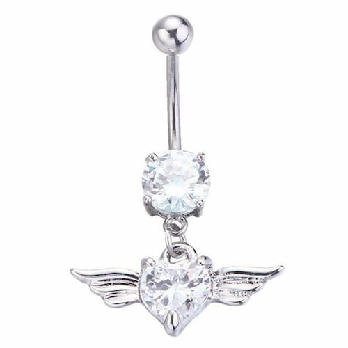 Piercing de umbigo de aço cirúrgico modelo com pedra de zirconia em forma de coralão e pingente com simbolo alado..Marca: love bijouxModelo: zirconia coração prataUnidades por embalagem: 1Espessura: 16 mmMateriais: açoTipo de piercing: umbigoZona de aplicação: umbigo