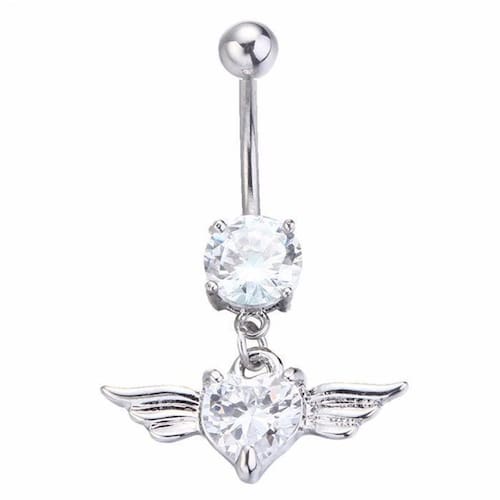 Piercing de umbigo de aço cirúrgico modelo com pedra de zirconia em forma de coralão e pingente com simbolo alado..