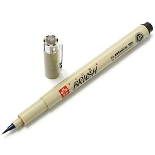 Pigma Brush Sakura, com ponta de pincel e tinta nankin. Ideal para desenhistas e ilustradores. Utilizado em ilustrações, caligrafia, projetos artesanais, álbuns de recordações. Tinta de pigmento permanente adequada para aplicações em arquivos, à base de água e de secagem rápida em superfície porosa. Resistente ao desbotamento, à água e a produtos químicos, após secagem. Ponta flexível suave para traços finos e grossos.