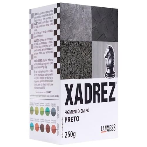 Refêrencia: 67326 Marca: LanxessO Pó Xadrez 250G Xadrez Preto 67326 - Lanxess, é um pigmento à base de óxido de ferro que pode ser utilizado nos mais diversos campos de aplicação. É muito utilizado para colorir argamassa e concreto.