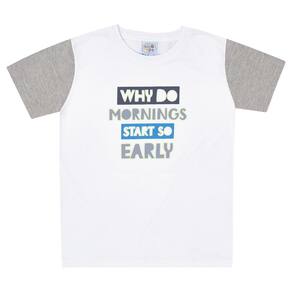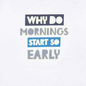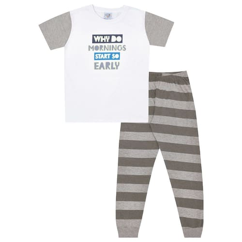 Este é o pijama ideal para seu garoto curtir uma bela noite de sono! Confeccionado em tecido meia malha, a camiseta na cor branca possuí as mangas na cor cinza e estampa com escrita “why do mornings start so early” (por que as manhãs começam tão cedo) e para deixar a peça ainda mais divertida a frase brilha no escuro. A calça possuí estampa rotativa com listras horizontais na cor cinza.\n