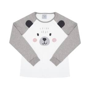 Nosso conjunto de pijama é composto pela blusa e a calça em tecidos meia malha na cor branco com mescla cinza. A blusa de manga longa possuí estampa frontal de ursinho com orelhas interativas e a calça com elastano na cintura também possuí estampa de patinhas de urso no joelho. Assim a hora do soninho se torna mais leve, quentinha e alegre!\n