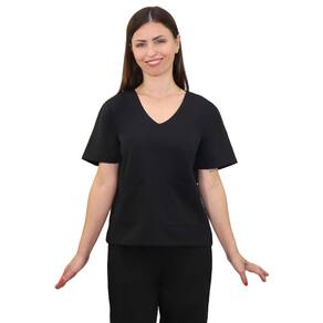 A Camisa possui decote em V e com um bolso frontal.