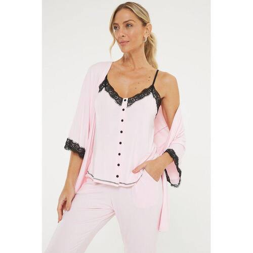 Este pijama traz conforto e elegância para quem o veste, a blusa possui alças finas com regulagem, Com renda vasada no decote e na barra da calça trazendo e estilo para a peça, a camisa com botões traz facilidade na utilização. O conjunto conta com um robe Lindo que traz um toque de elegância e versatilidade.