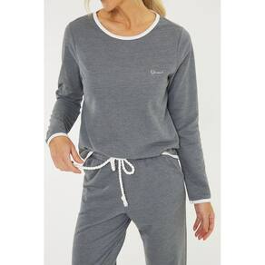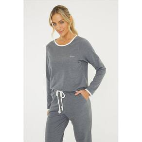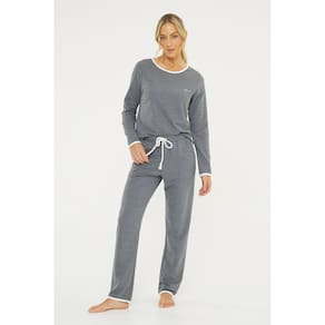 Produto Esse pijama é puro estilo, perfeito para seus momentos de descanso e lazer. A blusa com decote redondo tem o acabamento em friso contrastante. O friso contrastante também está presente na barra da calça e barra da blusa. Aos que amam bolso esse é o pijama perfeito! A calça possui um bolso funcional, que faz toda a diferença na peça, possui também um cadarço trançado que traz muito estilo. A calça com cós elástico, é puro conforto, pijama perfeito para o seu dia a dia.