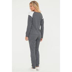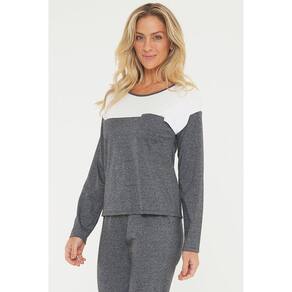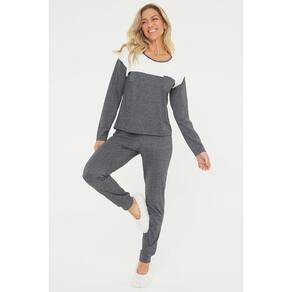Produto Pijama Feminino Longo mangas compridas, blusa em decote redondo com o ombro deslocado. Possui um recorte contrastante e bolso frontal. A calça com acabamento em punho na mesma malha. O cós em elástico que contribui com o conforto do pijama, detalhes que proporcionam muito estilo para o seu pijama.