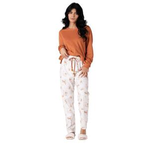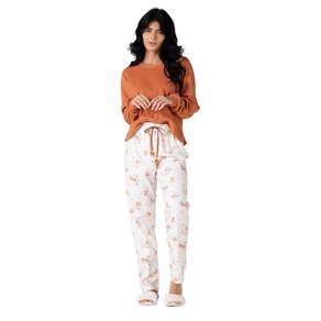 A calça com modelagem mais reta e elástico na cintura é uma opção prática e confortável para quem procura um pijama que se ajuste bem ao corpo. O falso amarrador e os pompons na cor caramelo dão um charme especial à peça.