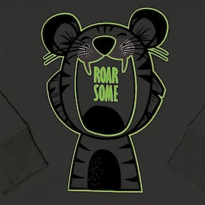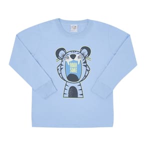 Pijama manga longo confeccionado em meia malha para os pequenos aventureiros. A camiseta na corhortênsia possuí estampa divertida de tigre bocejando com escrita "Rugido curto" e o detalhe esta na estampa que brilha no escuro. A calça na cor carbono possuí elastano na cintura para maior conforto na hora do sono. O pijama favorito dos pequeninos para a estação!\n