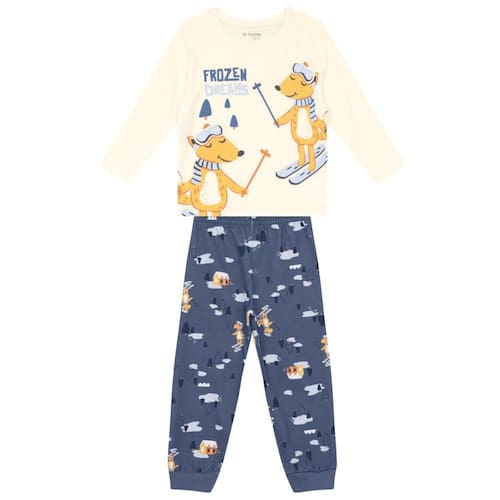 Proporcione noites de diversão e conforto com o pijama infantil menino da Brandili. Confeccionado em meia malha, a blusa apresenta uma encantadora estampa de animaizinhos que brilha no escuro, perfeita para despertar a imaginação. Com mangas longas e gola redonda, garante aquecimento e conforto. A calça, com estampa similar rotativa e cós elástico, proporciona liberdade de movimento. Esse pijama é a escolha perfeita para noites tranquilas e cheias de sonhos.