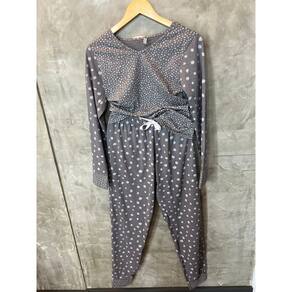 O conjunto com modelagem em poá é jovem e super atual. O cordão no cós da calça é um detalhe que trás um charme especial combinado com a estampa.