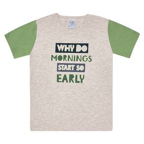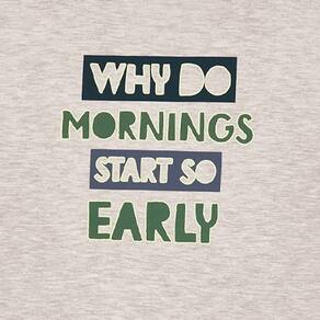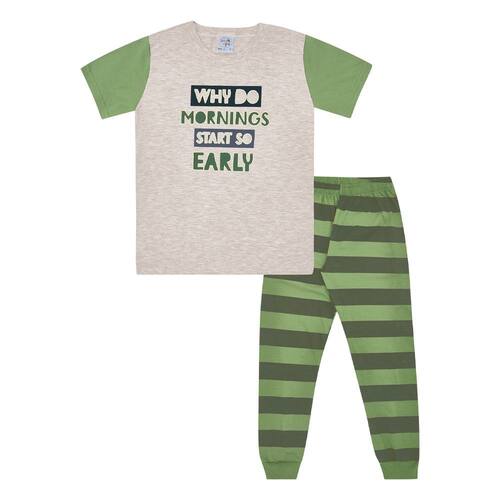 Meio quente, meio frio para não ficar na dúvida trouxemos o pijama kids! Confeccionado em tecido meia malha, a camiseta na cor mescla banana possuí as mangas na cor oliva e estampa com escrita “why do mornings start so early” (por que as manhãs começam tão cedo) e para deixar a peça ainda mais divertida a frase brilha no escuro. A calça possuí estampa rotativa com listras horizontais na cor oliva.\n