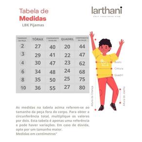 Para garantir o tamanho correto do pijama infantil Larthani, consulte a nossa tabela de medidas. Recomendamos comparar com uma peça já em uso para acertar na escolha. Em caso de dúvida, opte sempre por um tamanho maior para garantir o conforto do seu filho.