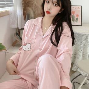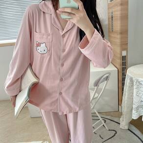 Pijama de outono/inverno com a adorável estampa Hello Kitty! • Composição principal do tecido: fibra de poliéster • Tipo de gola: lapela • Função: lazer, respirável, para dormir, elástica, caseira, confortável, • Estação adequada: inverno, outono • Estilo: desenho animado