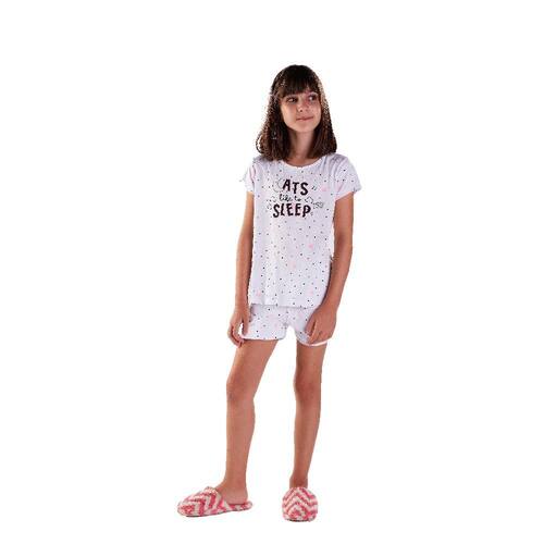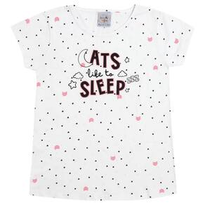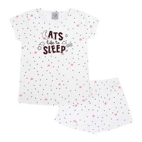 Novo conjuntinho Good Night By Pulla Bulla confeccionado em Meia malha com estampa rotativa de coraçõezinhos, proporcionando ainda mais conforto ao dormir. Uma Blusa na cor Branca com a estampa “Gatos gostam de dormir” e um Shortinho na cor Branca. Um look confortável e leve para a sua menininha descansar a noite toda.\n