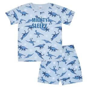 Os baby dinos também merecem uma boa noite de soninho. Confeccionado em tecido meia malha, este pijama possuí estampa rotativa de dinossauros na cor nuvem tanto na camiseta quanto no short. A camiseta possuí a frase “mighty sleepy” (muito sonolento) localizada no centro da peça. E para deixar a noite mais divertida, a frase estampada na camiseta brilha no escuro. Seu baby descansando com muito conforto e estilo!\n