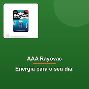 Pilha Alcalina Aaa C/2 Um poderosa tecnologia com as Pilhas Alcalinas AAA da Rayovac. Especificamente designadas para aparelhos tecnológicos de alto desempenho, nossas pilhas permitem que você realize suas atividades semlimites, com total liberdade e confiança em suas atividades. Com alta performance e durabilidade, as Pilhas Alcalinas AAA da Rayovac são a escolha certa para seus dispositivos eletrônicos. Nossas pilhas são projetadas para suportar aparelhos com alto consumo de energia, garantindo que você obtenha o melhor desempenho possível. Além disso, nossas pilhas também apresentam uma vida útil mais longa, reduzindo a necessidade de substituições frequentes. Com as Pilhas Alcalinas AAA da Rayovac, você pode estar seguro de que seus dispositivos estarão sempre funcionando corretamente, sem interrupções ou perda de dados importantes. Um poderosa tecnologia com as Pilhas Alcalinas AAA da Rayovac. Especificamente designadas para aparelhos tecnológicos de alto desempenho, nossas pilhas permitem que você realize suas atividades semlimites, com total liberdade e confiança em suas atividades.