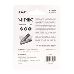 PILHA ALCALINA AAA C/4 1.5V - VP3AB4A As pilhas e baterias Vinik são a escolha perfeita para diversas situações, oferecendo desempenho confiável e durabilidade para todos os tipos de dispositivos. Seja para controles remotos, videogames, lanternas, sensores, brinquedos ou muitos outros aparelhos, nossas pilhas garantem energia quando você mais precisa. Disponíveis em uma ampla variedade de tipos e tamanhos, projetadas para atender às suas necessidades com eficiência e qualidade. Mais potência por menos preço. Características Tipo: Alcalina Tamanho: LR03 - AAA (palito) Voltagem: 1,5V Blister: 4 unidades