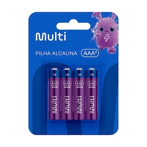 Marca: Multi Modelo: Pilha Alcalina AAA Com 4 Unidades Multi - PA002 Tipo: Pilha Alcalina Tamanho: AAA Quantidade: 4 unidades Durabilidade: Ate 5 anos Tecnologia: Antivazamento Composicao: Livre de mercurio e cadmio Indicacao de uso: Dispositivos de medio e alto consumo Garantia: 60 meses